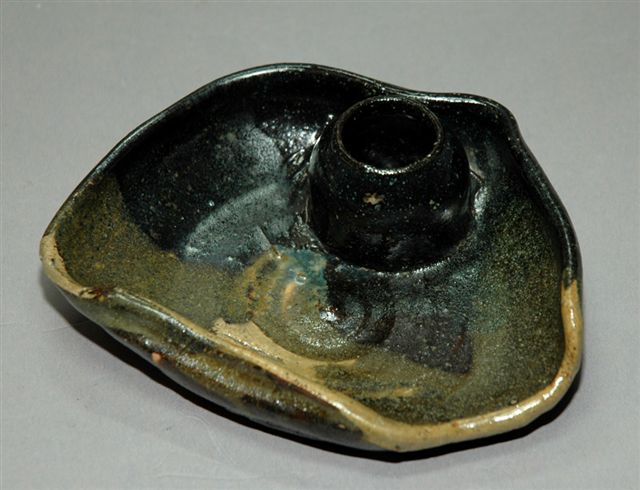 ENCRIER Art Nouveau en grès, d'inspiration japonisante sur une base coupelle cabossée à fonction plumier et sur laquelle est posé un petit godet encrier en forme de petit vase à épaulement. Le décor est à émaillage dans les tons sombres allant du noir à ocre en passant par des nuances de brun.