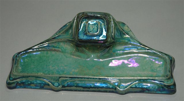 ENCRIER Art Nouveau en grès par GURSCHNER, modèle n° 140 du catalogue de 1920, (seule pièce de ce modeleur dessinée pour la Société durant une courte collaboration avant la première guerre mondiale). Le porte godet encrier avec bouchon au centre et en arrière de la base plumier. Le décor reprend des motifs floraux sous couverte d'émail flammé à reflets métalliques bleu-vert.