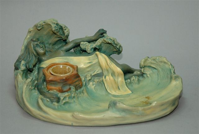 ENCRIER Art Nouveau en terre de pipe à motif d'une naïade émergeant des flots tenant le godet encrier et faisant le dosseret d'un plateau plumier. La couverte est réalisée dans les tons vert, ivoire et ocre.