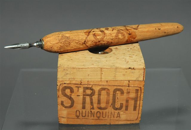 ENCRIER pour le QUINQUINA St ROCH. Base cubique et porte plume en liège à la marque. Début XXème.
