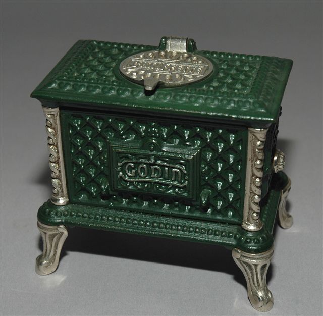 ENCRIER en fonte émaillée vert et argent reproduction des produits calorifères de la marque GODIN & CIE (SOCIETE DU FAMILISTERE DE GUISE -AISNE). Modèle "CHAUFETTE" n° 15, pour un godet encrier sous la trappe circulaire en dessus du foyer. Présenté dans le catalogue "Album Général de 1914" .