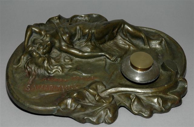 ENCRIER en fonte de fer à patine bronze vert dans le style Art nouveau d'un décor de femme allongée sur un espace floral. Il porte un godet encrier à bouchon vissé. Avec la mention: Offert par LA SAMARITAINE.