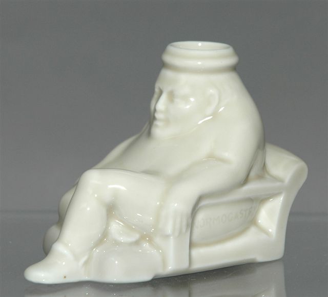 ENCRIER en porcelaine blanche de Limoges (Tharaud) à décor d'un estomac obèse assis sur un fauteuil. L'ouverture de l'encrier se trouve sur la tête. Support publicitaire pour les ERGEPATINE et NORMOGASTRYL. Signé au revers: Tharaud Limoges.
