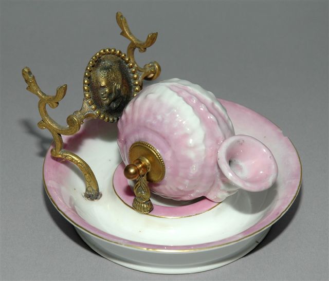 ENCRIER en porcelaine, système à BASCULE de forme escargot pivotant sur un axe horizontal vers un râtelier fermoir et ergots repose plume. Il est fixé au centre d'un plateau coupelle circulaire. Les coloris sont rose nacré sur fond blanc et filets or. (petit éclat en bordure de la coupelle).