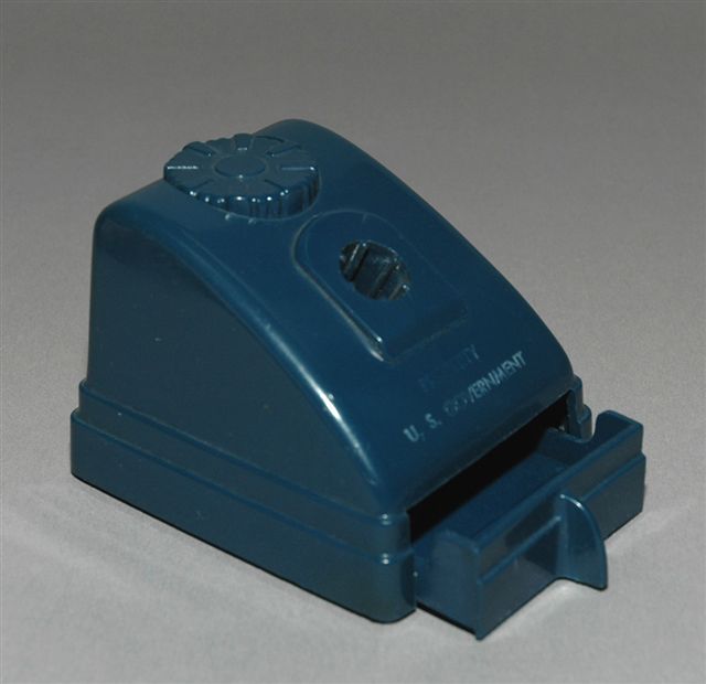 ENCRIER INVERSABLE en bakélite bleu à réservoir forme caisse enregistreuse avec tiroir rangement plumes. Modèle officiel des administrations U S (mention gravée: PROPERTY U.S. GOVERNMENT et marque du fabriquant (Hamilton-King made in U.S.A.