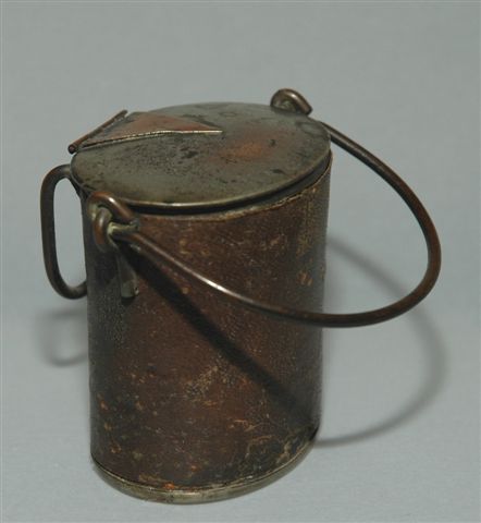 ENCRIER de VOYAGE forme de seau ovoïde en métal et cuivre gainé cuir avec une anse portable à la ceinture, couvercle non sécurisé car la préparation de l'encre s'y faisait juste avant d'écrire.