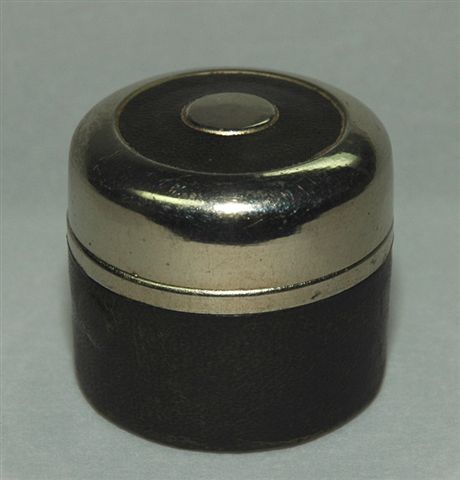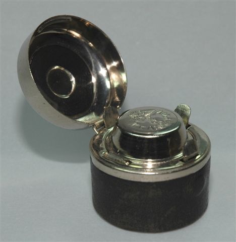 ENCRIER de VOYAGE dans un étui de forme cylindrique en métal chromé dont la base et le dessus du couvercle sont gainés de cuir noir. Le couvercle est à charnière avec ouverture par bouton poussoir. L'intérieur porte sur le fermoir les lettres K.K.A et PRIV, autour d'un emblème d'aigle à deux têtes. Il recèle le flacon encrier cylindrique en verre obturé par un fermoir bouchon à système de cliquet.
