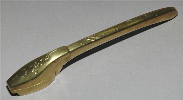 ÉCRITOIRE de VOYAGE sous forme d'un étui en bronze à décor ciselé bambou et fleurs de cerisiers, sa forme curve permet une bonne prise en main. Ce nécessaire composé de deux compartiments contient l'encrier dans sa tête, et le grattoir et la plume d'oie se rangent dans la partie longue de l'étui.