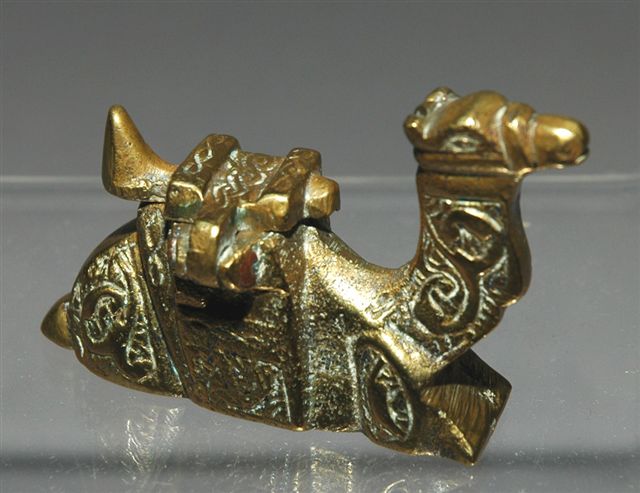 ÉCRITOIRE de VOYAGE,origine Moyen-Orient sous forme d'un chameau en bronze doré à décor ciselé d'une sellerie riche sous laquelle est situé l'encrier.