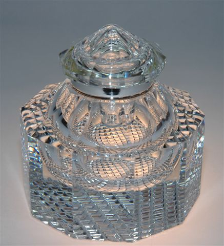 ENCRIER en cristal de BACCARAT modèle MINISTRE, d'une édition à tirage limité, n° 101 / 300. De forme décagonale avec un bouchon en pointe de diamant retenu par des anneaux sertis en argent massif avec articulation charnière, il couvre le godet en cristal. Le décor du fond en motifs de carrés se reflète dans l'ensemble des facettes de la pièce. Gravage lettres anglaises Baccarat et n° de l'exemplaire à la base d'une des facettes et marque en rond gravée à l'acide au centre du revers.