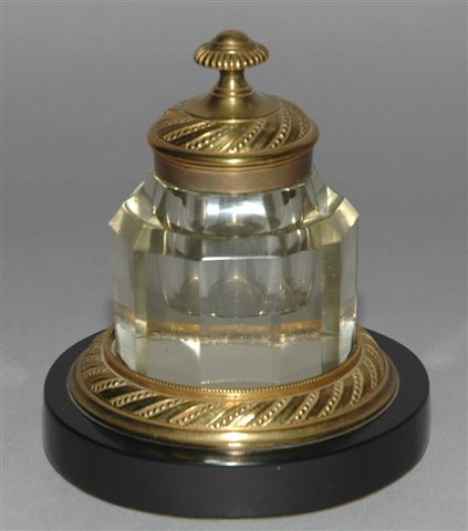 ENCRIER cylindrique pentagonal époque N III en CRISTAL et bronze doré sur socle circulaire en marbre noir. Il est fermé par un bouchon amovible en bronze doré.