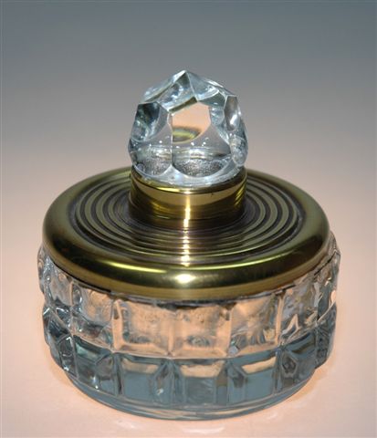 ENCRIER flacon cylindrique en CRISTAL à taille de carrés, couvert par une plaque bronze doré sur laquelle est serti le bouchon charnière, conique en cristal à facettes.