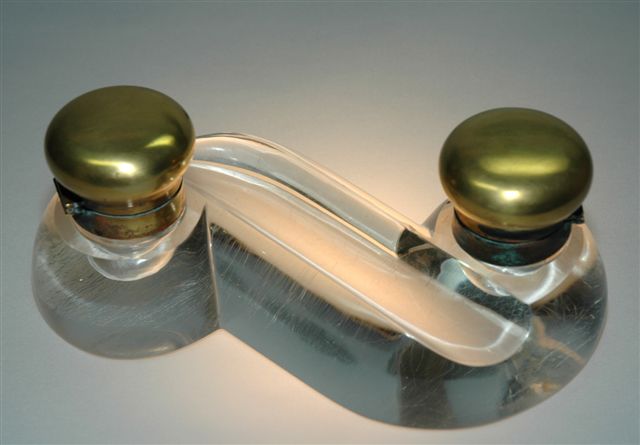 ENCRIER Art Déco en CRISTAL forme d'un S offrant deux godets encriers de part et d'autre d'une goulotte repose plume. La fermeture des godets encriers est assurée par bouchons laiton doré avec articulation charnière.