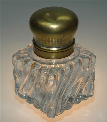 ENCRIER flacon cubique en VERRE SOUFFLE à taille godrons torves avec une base tenon pour prendre place dans un support. Il est fermé par un bouchon en laiton doré forme boule à articulation charnière sertie autour du col.
