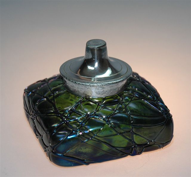 ENCRIER Art Nouveau style LOETZ forme d'un flacon carré en VERRE SOUFFLE coloris irisé vert à décor de nervures d'inspiration végétale. Il est fermé par un bouchon en argent massif en chapeau conique avec articulation charnière serti autour du col.