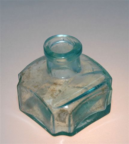 ENCRIER flacon cubique aux coins coupés appelé " courtine ", en VERRE SOUFFLE coloris turquoise, très utilisé par les poilus durant la période de la 1ère guerre mondiale. Le bouchon devait être en liège sur un col étroit qui permettait le maintien du porte plume ainsi qu'une rainure sur l'épaulement.