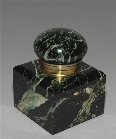 ENCRIER en MARBRE vert Sainte Anne des Pyrénées de forme cubique. Il est fermé par bouchon charnière serti par bagues laiton doré sur un godet.