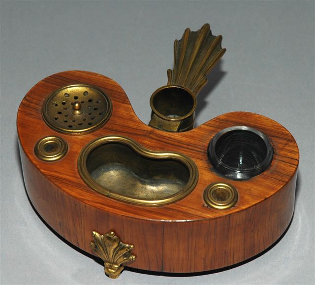 ÉCRITOIRE BOUGEOIR en placage de NOYER forme haricot pour deux godets, un encrier et un poudreur autour d'un réceptacle central et deux petits tubes pique plume. Il repose sur trois pieds palmettes et sur l 'arrière il est équipé d'une poignée avec binet pour la chandelle.