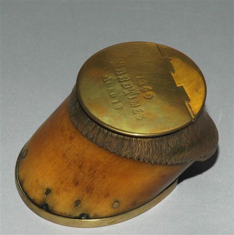 Véritable sabot qui a fait l'objet d'un travail d'orfèvrerie en bronze doré pour être transformé en ENCRIER. Hommage d'un propriétaire reconnaissant et en souvenir, de son cheval de course sûrement très méritant. Le godet encrier est en cristal bleu avec cerclage bronze et il est obturé par un couvercle bronze doré serti avec articulation charnière. Au-dessus il est gravé: " 1869 HardTimes Aged 18 ".