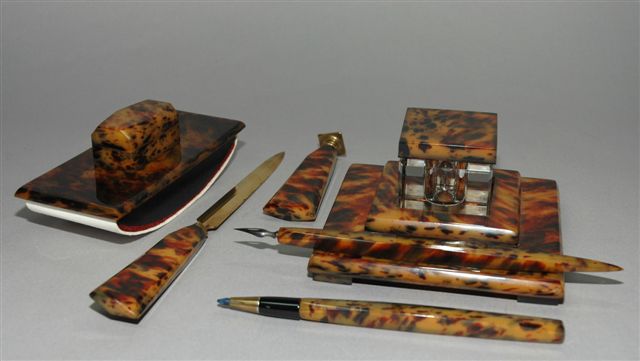 GARNITURE DE BUREAU en écaille de tortue d'époque Art Déco. Elle est composée d'un encrier cubique en cristal sur sa base carrée plumier en terrasses et fermé par un bouchon carré en écaille. Un buvard, un coupe papier, un porte plume, un porte mine et sceau à cacheter complètent cet ensemble rare dans cette matière et dans cet état de conservation car l'écaille n'a subit aucune altération dans les formes et les couleurs.