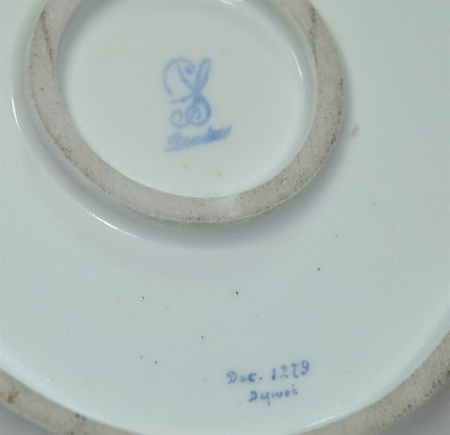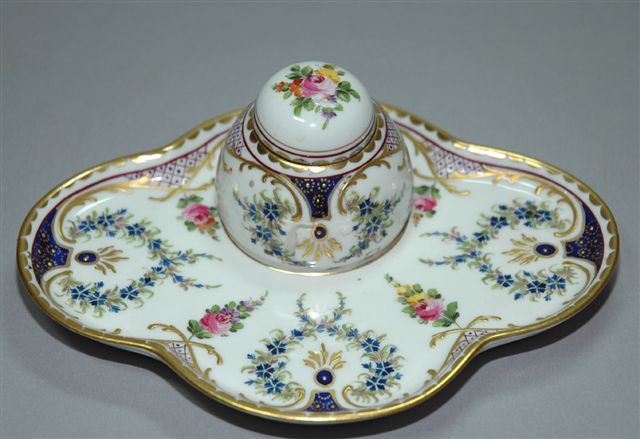 (ALLEMAGNE). ENCRIER en PORCELAINE de DRESDE, le porte godet conique est solidaire du plateau plumier à bord polylobé surligné de filets et motifs or. Le godet encrier est couvert par un bouchon au bouquet. Le décor est à rameaux de feuillage et de tiges fleuries. Au revers il porte la marque et la mention Dresden ainsi que le n° du décor: Dec 1279.