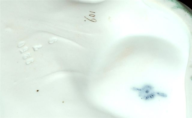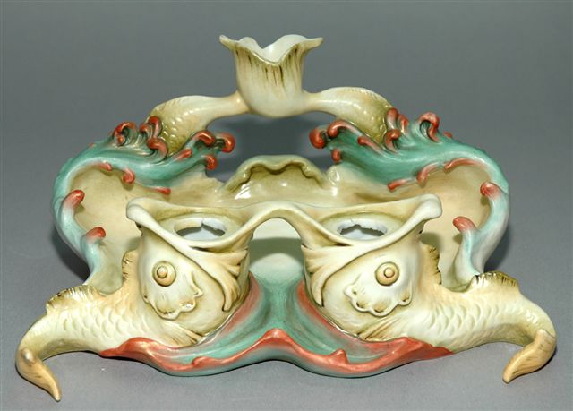 (ALLEMAGNE). ÉCRITOIRE Art Nouveau en PORCELAINE tendre de LUDWIGSBURG. D'inspiration aquatique avec ses deux poissons porte godets qui émergent des flots formant le plumier avec en dosseret les vagues d'ou sortent deux queues de poissons réunies en bougeoir. Les coloris pastel combinent l'ocre, le vert et le rouge. Au verso marque de la manufacture. (manque les godets).