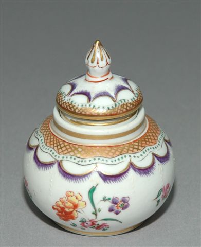 (COMPAGNIE DES INDES). ENCRIER en PORCELAINE dure de forme flacon ventru couvert pour un godet encrier. Le décor à motifs floraux et guirlandes festonnées est rehaussé de filets or. Marque encrée rouge au revers.