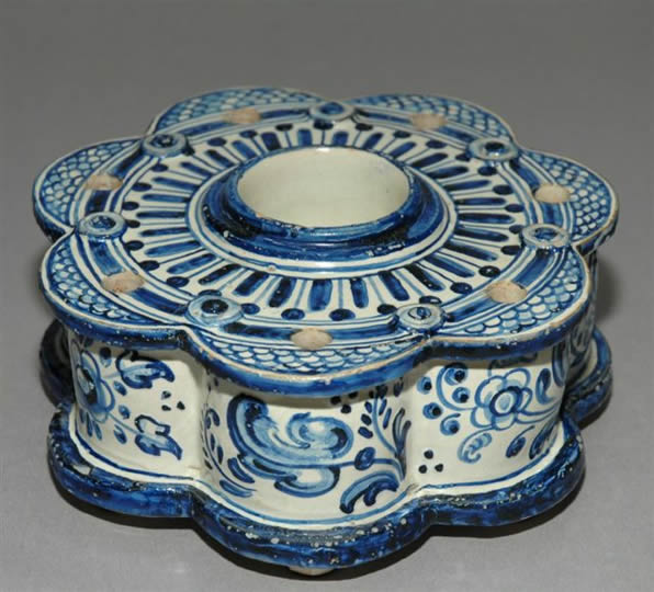 (ESPAGNE). ENCRIER en FAÏENCE forme cylindrique polylobé reposant sur 7 pieds présentant un godet encrier central entouré de sept trous pique plume. Le décor est à base de fleurs et rameaux fleuris et filets traité en bleu.