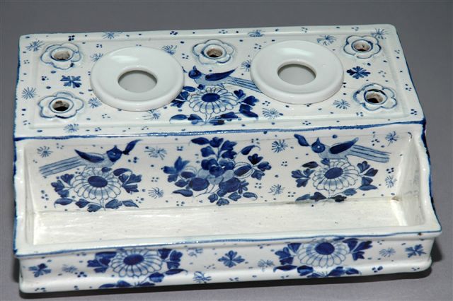 (GRANDE-BRETAGNE). ÉCRITOIRE forme cassette en FAÏENCE avec compartiment plumier en avant d'une terrasse portant deux godets encriers et cinq trous pique plume décorés de fleurs. Le décor de fleurs et oiseaux est traité en camaïeu de bleu surligné de filets bleus sur les arêtes de la pièce. Porte au revers le n° de modèle 543.