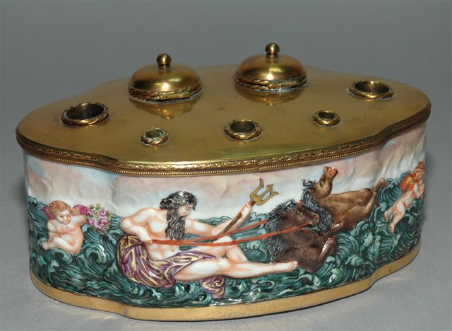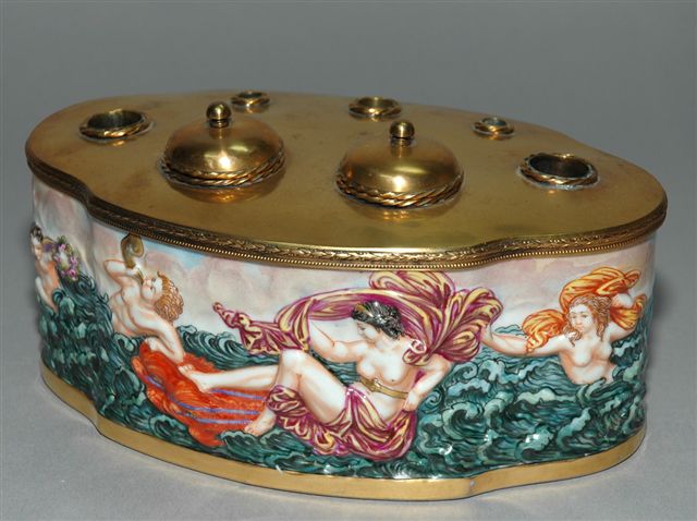 (ITALIE). ÉCRITOIRE en PORCELAINE de Capo Di Monte, en forme de coffret polylobé couvert par un couvercle en laiton doré recevant deux porte godet à bouchon charnière pour deux godets encriers en cristal, trois trous pique plume et deux étuis pour d'autre accessoires tels un bâton de cire et un sceau à cacheter.