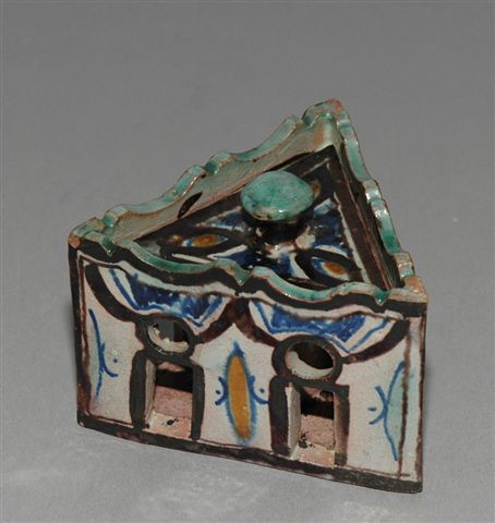 (MAROC?). ENCRIER en CERAMIQUE émaillée, forme triangulaire représentant une maison typique avec ses ouvertures et sur la terrasse le godet encrier et les trous pique plume. Au verso marque encrée en écriture arabe.