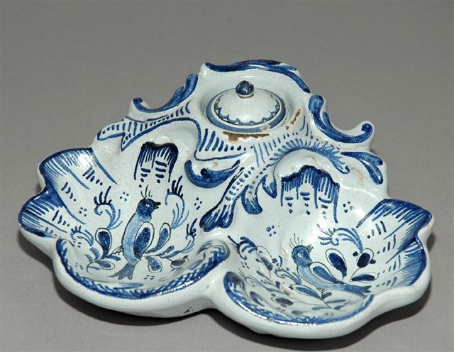(PAYS-BAS). ENCRIER en FAÏENCE du XVIIème, forme de deux coquilles accolées à fonction plumier surmonté par la terrasse porte godet encrier avec bouchon. Le décor de Delft d'oiseaux et de fleurs en camaïeu de bleu sur couverte blanc laiteux.