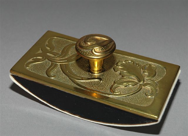 BUVARD-TAMPON base BOIS, plaque décorative et prise bouton en bronze doré au motif Art Nouveau.