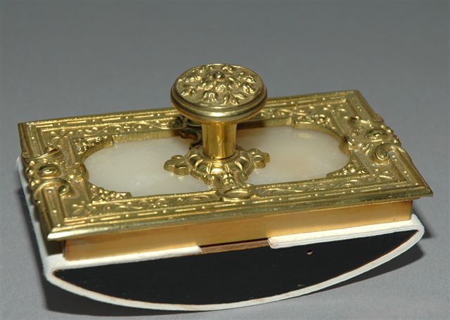 BUVARD-TAMPON base BOIS, plaque décorative en albâtre et bronze doré avec un décor de style Renaissance.