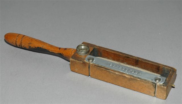 GRATTOIR en BOIS avec poignée, réservoir à déchets et emplacement pour une petite brosse essuie plumes et mines. Utilisé pour rénover le bec des plumes d'oie ou les mines de crayon graphite.