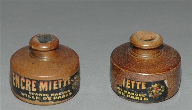 ENCRE MIETTE, dans deux flacons encriers en GRES couleur ocre, fermés par bouchons liège d'origine. Marquage par étiquette " Encre MIETTE "
