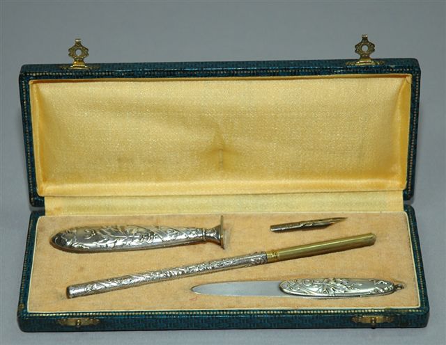 Contient: l'ouvre lettre, le cachet, le porte-plume monture doré avec plume ancienne.