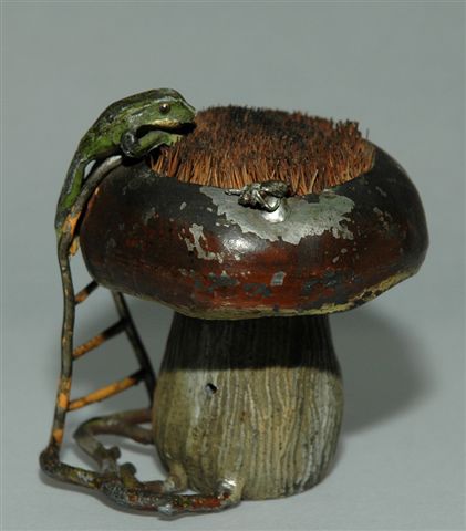 ESSUIE-PLUME en ETAIN peint forme d'un cèpe au sommet duquel une grenouille accède par une échelle pour attraper un insecte.