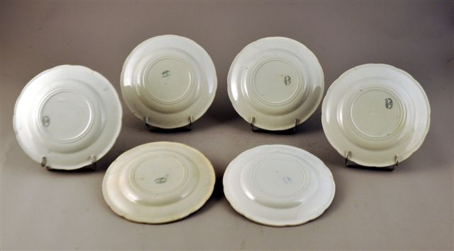SUITE DE SIX ASSIETTES "DEVINETTES" en faïence à bord festonné, à décor au centre d'une devinette en impression de noir, sur l'aile d'une guirlande de fleurs, de rubans et d'une frise d'oves en camaïeu de bleu, sur le marli d'une frise géométrique en camaïeu de bleu.