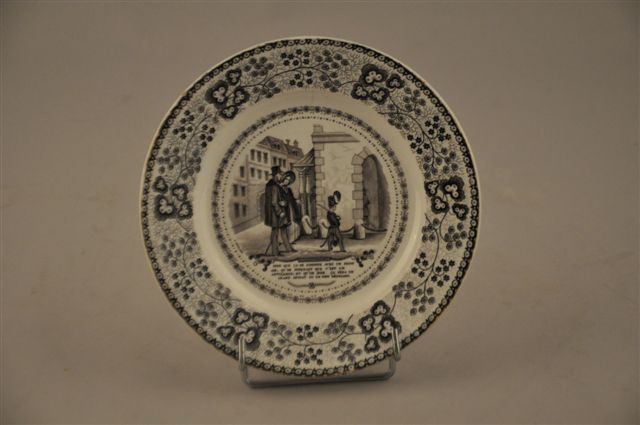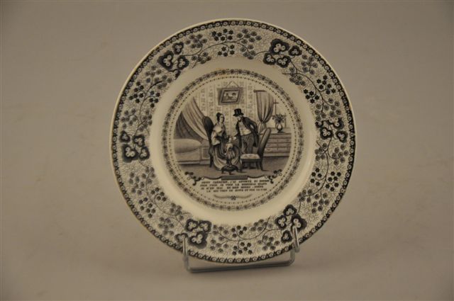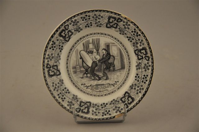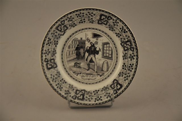 SUITE DES DOUZE ASSIETTES DU "MUSÉE POUR RIRE" en faïence à bord uni, à décor en impression de noir, au centre de scènes humoristique et sur l'aile de dentelles de fleurs. Gravure de J. Copeland (six ébréchées).