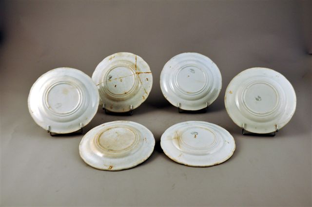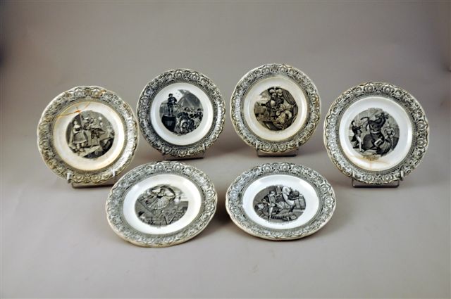 SUITE DE SIX ASSIETTES "PLAISIRS FORAINS" en faïence à bord festonné, à décor en impression de noir au centre d'une scène de Cirque, sur l'aile d'une frise de feuilles d'acanthes et de tulipes. Gravure de J. Copeland (assiettes n°5 et 9 restaurées).