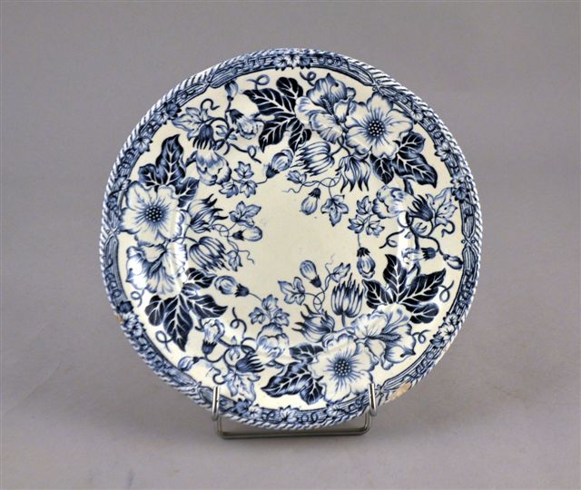 ASSIETTE en faïence à bords contournés, motifs imprimés bleus composés de fleurs stylisées rappelant celle des églantiers. Inspiration de la porcelaine anglaise ( Col scié).