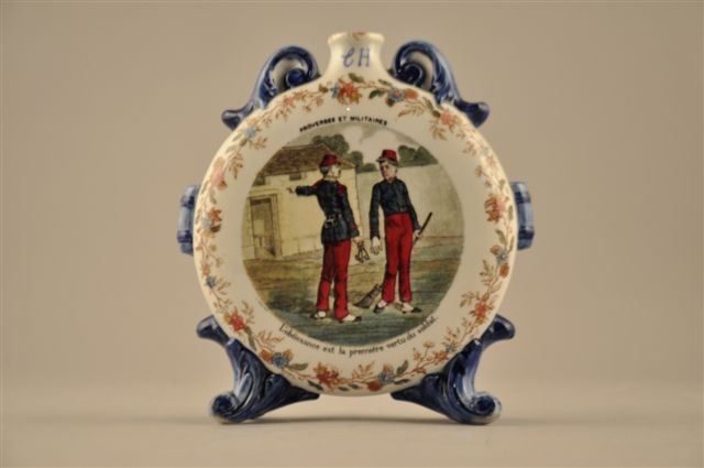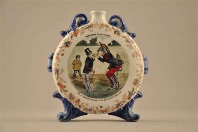GOURDE DE CONSCRIT en faïence de forme rocaille, à décor imprimé de proverbes militaires rehaussés de couleurs et gravés par Copeland avec d'un côté "L'obéissance est la première vertu du soldat" et de l'autre "On a souvent besoin d'un plus petit que soi". La gourde repose sur quatre petits pieds enroulés et feuillagés peints en camaïeu de bleu. Initiales C.H. sur le col (col raccourçi à la meule).