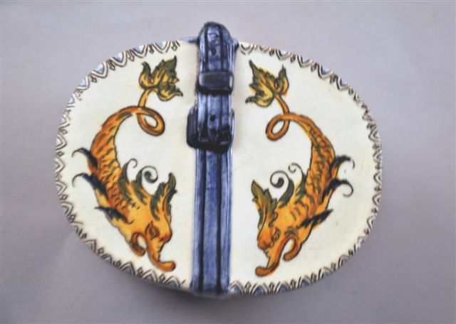 CARTON À CHAPEAU en faïence, à décor de dauphins et de sphinges sur fond blanc dans le goût de la Renaissance italienne (Urbino).