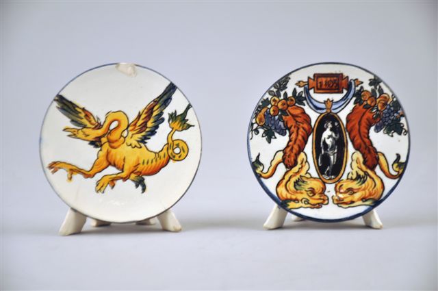 PAIRE DE PORTE-DÎNER RONDS en faïence, à décor pour l'un, d'un oiseau fantastique et pour l'autre d'une divinité sur fond noir dans un médaillon flanqué de deux dauphins à la corne d'abondance sur fond blanc dans le goût de la Renaissance italienne (un éclat sur une assiette et un pied restauré).