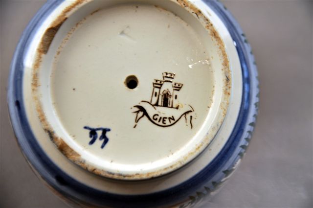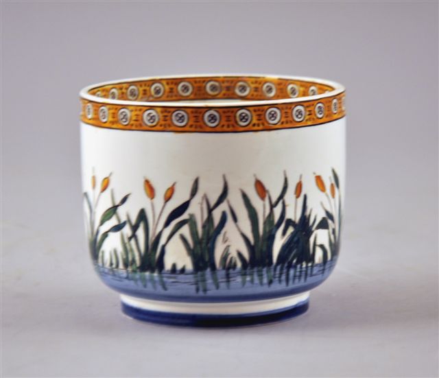 Petit CACHE-POT ROND en faïence, à décor de chevaux marins tirant une coquille Saint-Jacques conduits des oiseaux fantastiques dans un décor de roseaux de fond blanc dans le goût de la Renaissance italienne. Une frise contourne le col à l'extérieur et à l'intérieur (fond percé, fêle).