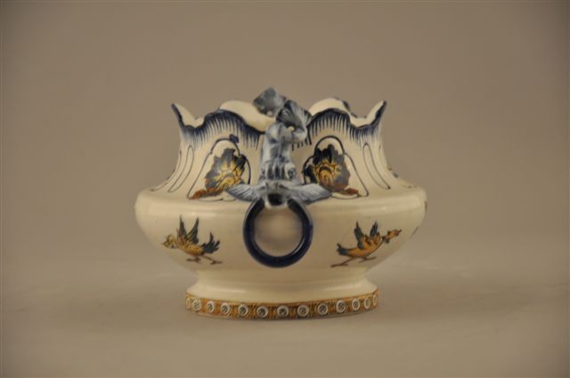 Petite JARDINIÈRE ROCAILLE ronde à anses de dauphins" en faïence, dans le goût de SEVRES, à bords découpés et à décor "a trofei" sur fond blanc dans le goût de la Renaissance italienne.