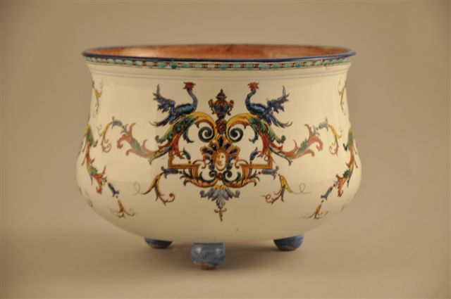 CACHE-POT VENTRU sur trois petits pieds boules en faïence, à décor en impression de brun rehaussée de couleurs vives de lambrequins et médaillon sur fond blanc dans le goût de la Renaissance italienne (Urbino) (fond percé, un pied décollé).