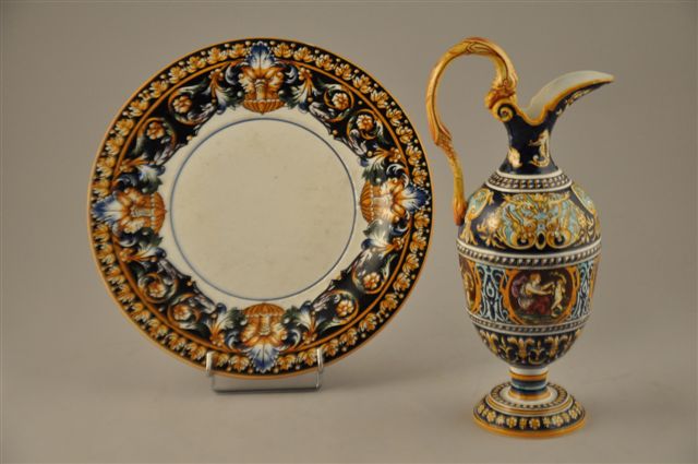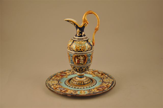 AIGUIÈRE DE "VÉNUS À L'AMOUR" ET SON PRÉSENTOIR en faïence, anse jaune à tête de griffon. Riche décor polychrome sur le corps de l'aiguière et l'aile du présentoir figurant dans trois cartouches à fond brun-chocolat "Vénus et l'amour" d'après la tradition italienne reprise à Nevers. Les cartouches se détachent sur un fond bleu nuit alternant avec des motifs jaune et turquoise d'arabesques, de chimères et de masques. Le centre du présentoir légèrement bombé présente un portrait de guerrier casqué (accident, anse recollée).