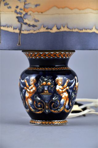 VASE à col évasé en faïence, à décor italianisant de rinceaux, chimères et ignudi sur fond bleu nuit monté à l'électricité.